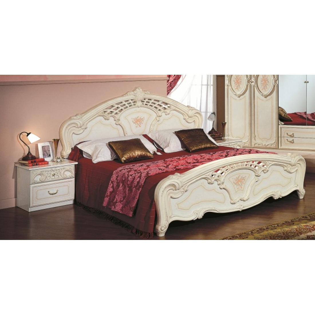Двуспальная кровать Роза (беж) от Российской фабрики "ДИА мебель". Выполнена в элегантном классическом стиле. Такая большая и комфортная кровать с ортопедическим основанием, поможет Вам расслабиться и насладиться хорошим отдыхом после рабочего дня. Она выполнена в бежевом цвете с глянцевым покрытием, и золотистым орнаментом на фасадах. Обращает внимание на себя декоративная фрезеровка изголовья кровати.