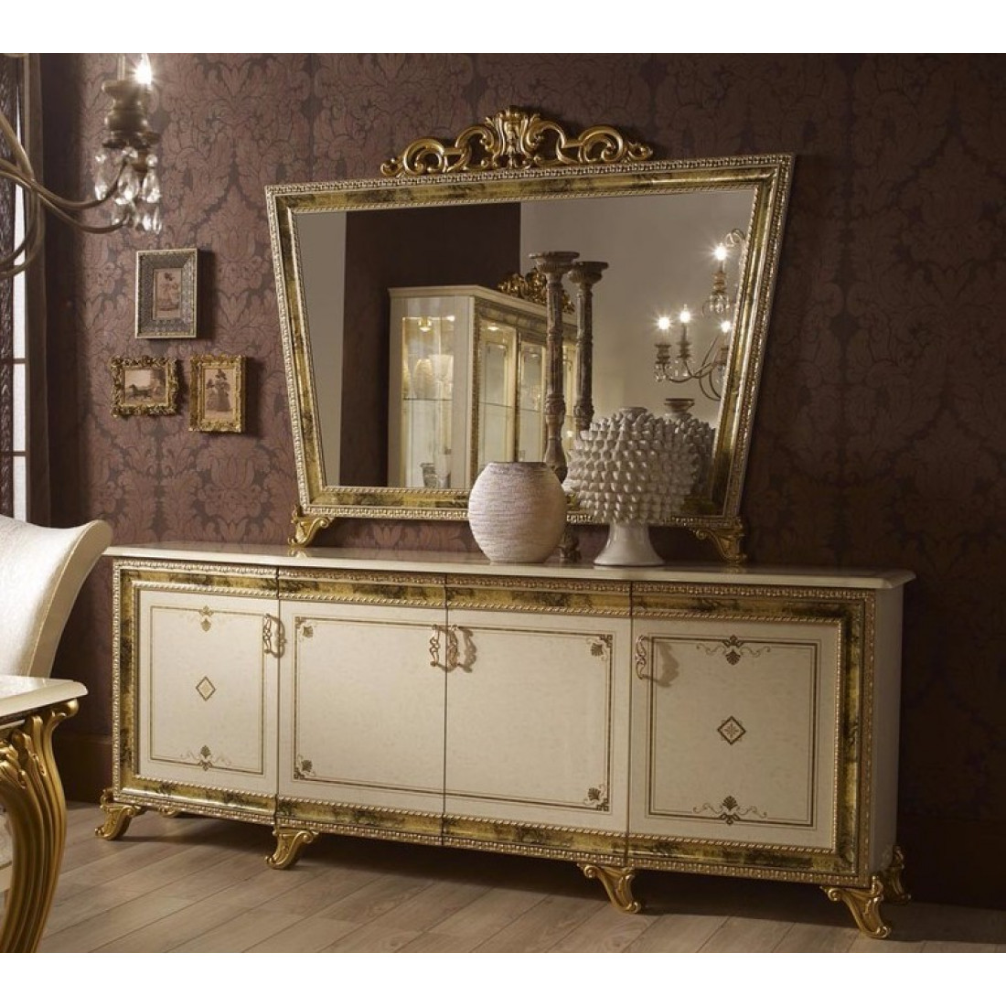 Комод для посуды Катя (беж) - выполнен в классическом стиле от Российской фабрики "ДИА мебель". Бежевый цвет с элементами позолоты и глянцевым покрытием на фасаде придают атмосферу богатства. А дополнение его большим зеркалом в золотистой объемной рамке придаст чувства легкости и визуально поможет расширить комнату. Такой комод не займет много места и будет незаменимым модулем в вашей гостиной.