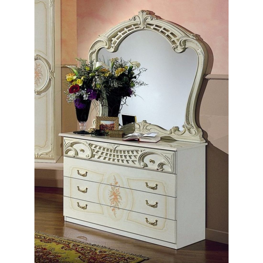 Комод Роза для белья Роза с зеркалом (беж) от Российской фабрики "ДИА мебель". Выполнен в классическом стиле. Бежевый цвет с глянцевым покрытием и орнаментом на фасаде придает этой модели еще больше элегантности. Большая объемная рамка в которую заключено зеркало, придает атмосферу богатства, а зеркало придаст комнате чувства легкости. Такой комод будет незаменимым модулем в вашей спальне.