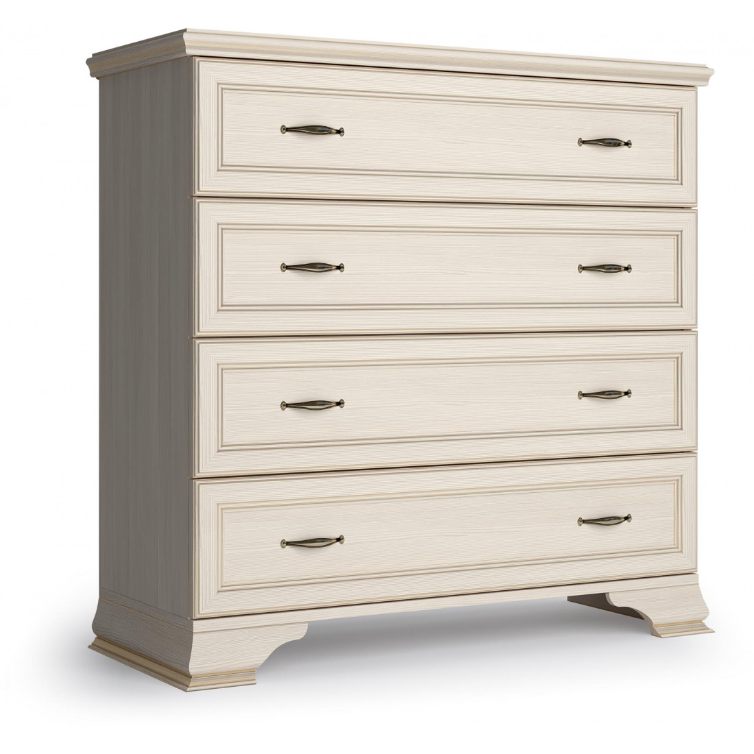 Коллекция производится в текстуре «бодега белый» с эффектом золотого патинирования. Облик «Сиены» дополняют рамочные фасады и карниз в классическом стиле, а также эффектные опоры из МДФ. Мебель комплектуются металлической лицевой фурнитурой премиум-класса в цвете «старая бронза» и надежной крепежной фурнитурой.