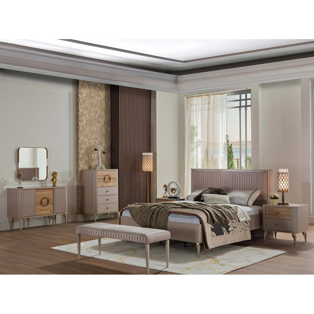 Кровать Санвито SANV-26 оригинальная по дизайну турецкая кровать в теплых постельных тонах из коллекции SANVITO. Мягкая спинка кровати декорирована тканью с вертикальной прострочкой. Скругленные боковины спинки с рифленой поверхностью создают объемный эффект. Кремовый цвет кровати прекрасно гармонирует с золотистыми вставками на витиеватых ножках. Боковины корпуса так же имеют округлую безопасную форму. Кровать представлена тремя размерами спальных мест: 150*200, 160*200, 180*200.