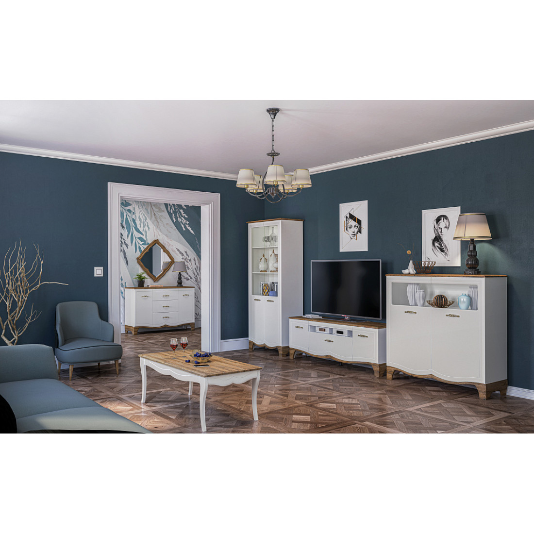 В композиции мебели для гостиной Тиффани присутствуют все элементы, которые призваны обеспечивать комфорт и максимум удобства своим хозяевам: эргономичная тумба под теливизор, высокая многофункциональная тумба, застекленный книжный шкаф (витрина), открытые навесные полки. При желании можно купить модульную гостиную Тиффани, укомплектовав другими элементами серии.