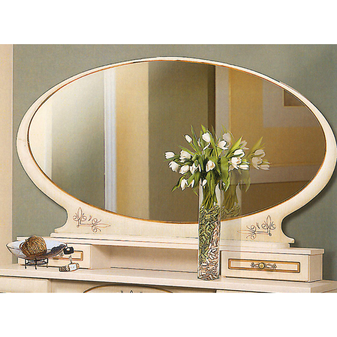 Овальное зеркало в спальню СП-001-08П серии Василиса от Мебель-Неман наделено характерной для стилистического оформления формой эллипса. Купить приставное зеркало можно в комплекте с комодом серии или туалетным столиком – чтобы добавить функциональности и продуманности в интерьер.
