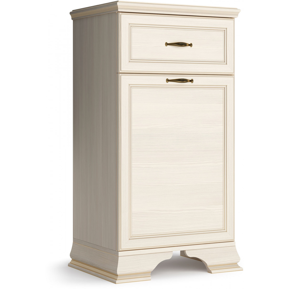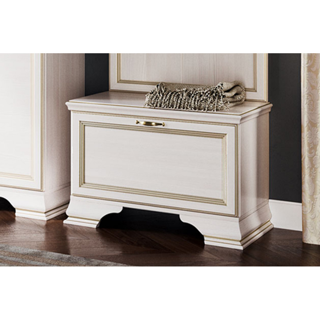 Модульная программа для прихожей «Сиена» производится в текстуре «бодега белый» с эффектом золотого патинирования. Облик «Сиены» дополняют рамочные фасады и карниз в классическом стиле, а также эффектные опоры из МДФ.