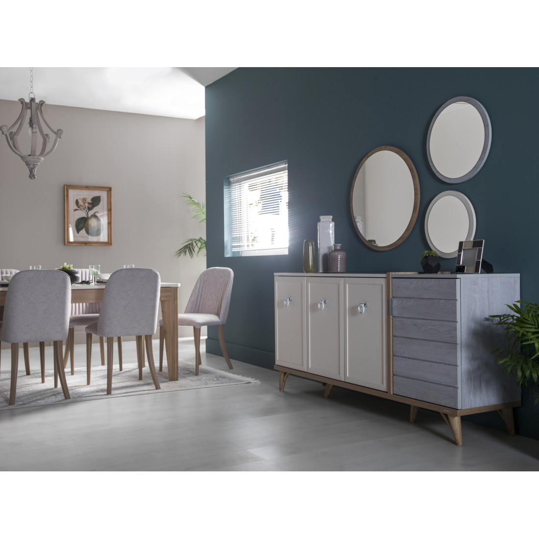Широкий буфет для посуды Мавенна в современном стиле прованс от турецкой фабрики Bellona придаст дополнительного одобрения за вместительность и функциональность. Снаружи прилавок выполнен в сочетании молочного цвета и серой имитации горизонтальных досок, с декоративной отделкой цвета орех. Внутри в широком отделении выдвижной ящик с разделителями для столовых приборов, в узких отделениях- полка.