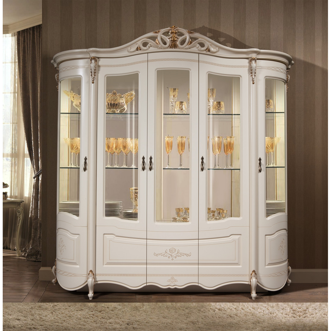 Шкаф-витрина пятидверная Аллегро 8 (белый) – данная модель сделает вашу гостиную неповторимой и нарядной.  Ее стеклянные дверцы и зеркальный корпус придадут комнате светлую атмосферу, а стеклянные полки для посуды сделают эту витрину легкой и воздушной даже не смотря на ее мощный с первого взгляда фасад. Резные вставки в сочетании с тонкой росписью подчеркнут классический стиль и послужат показателем богатства и престижа хозяев дома.