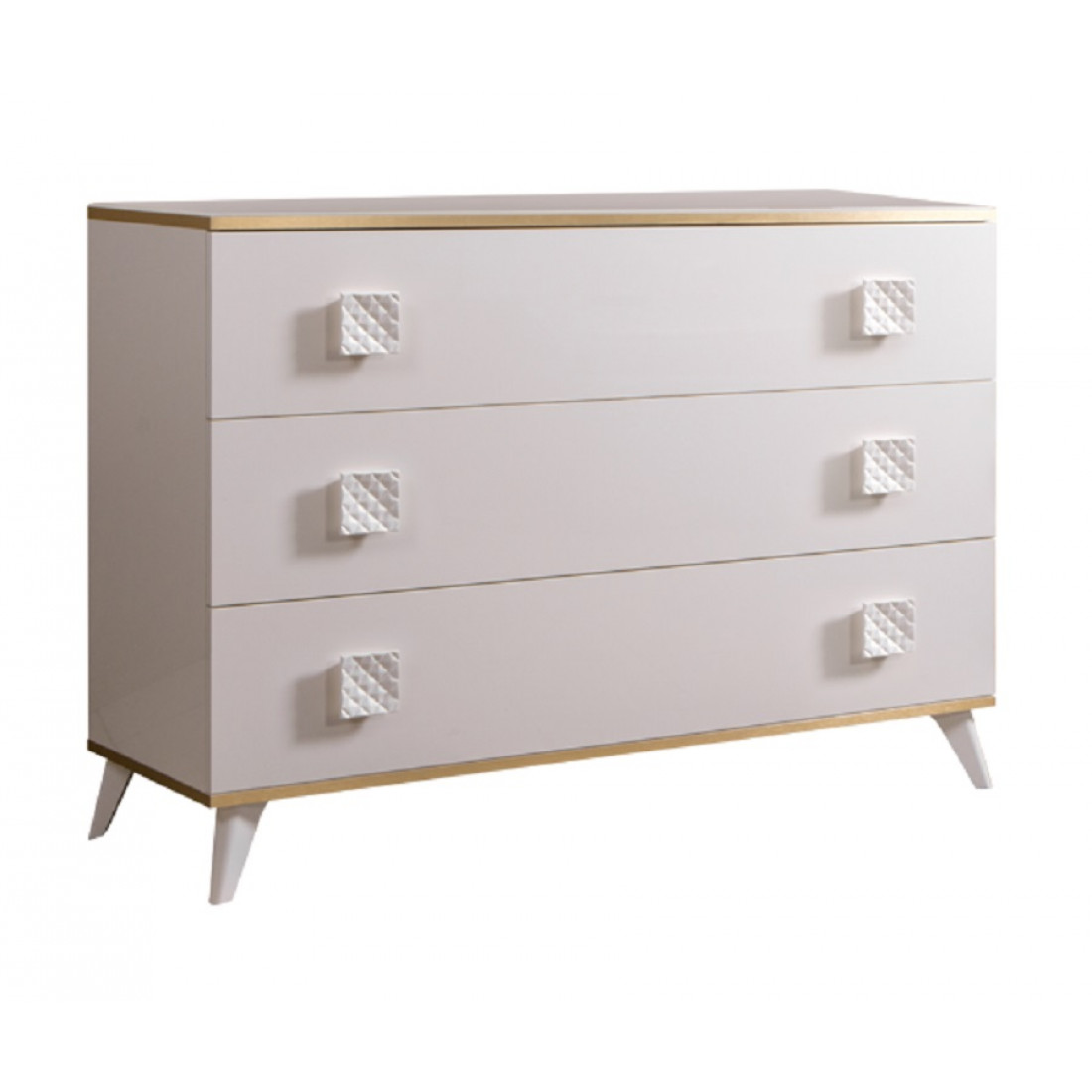 Великолепно вписались в концепцию спальни «Diora» поверхность комодов и тумбочек  выполненная из стекла в соответствии с цветами корпуса. Это решение позволяет чаще делать влажную уборку и не боятся, что мебель испортится.