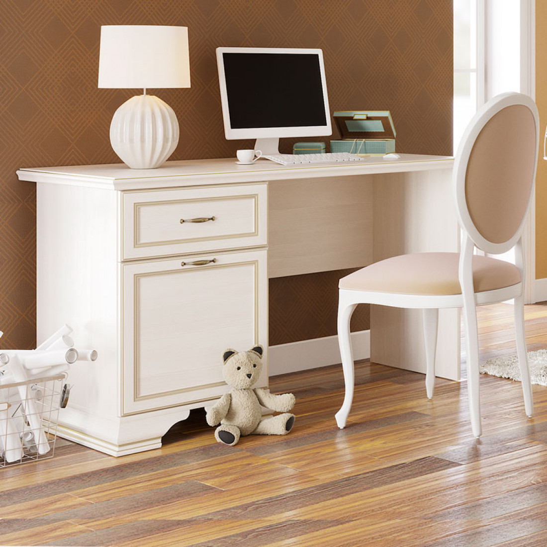 Коллекция производится в текстуре «бодега белый» с эффектом золотого патинирования. Облик «Сиены» дополняют рамочные фасады и карниз в классическом стиле, а также эффектные опоры из МДФ. Мебель комплектуются металлической лицевой фурнитурой премиум-класса в цвете «старая бронза» и надежной крепежной фурнитурой.