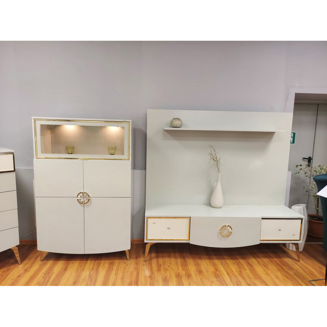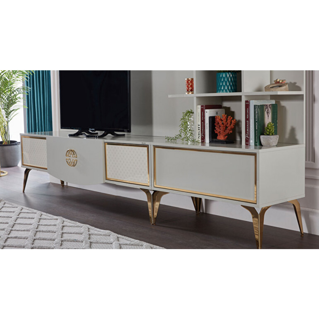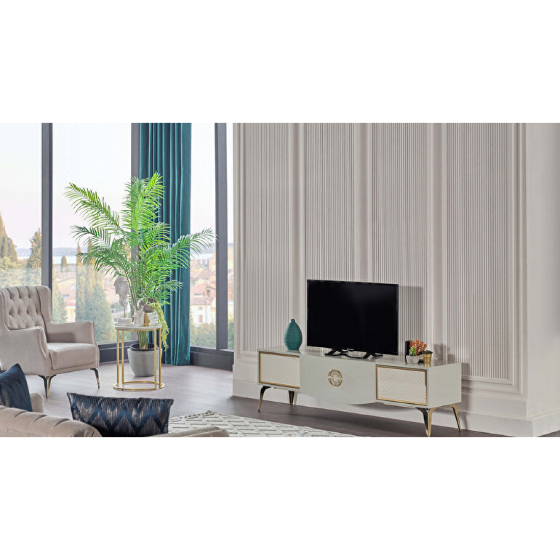 Тумба под ТВ Валеско с рисунком в стиле АРТ-ДЕКО, золотисто-желтыми фитилями, металлическими ручками,ножками